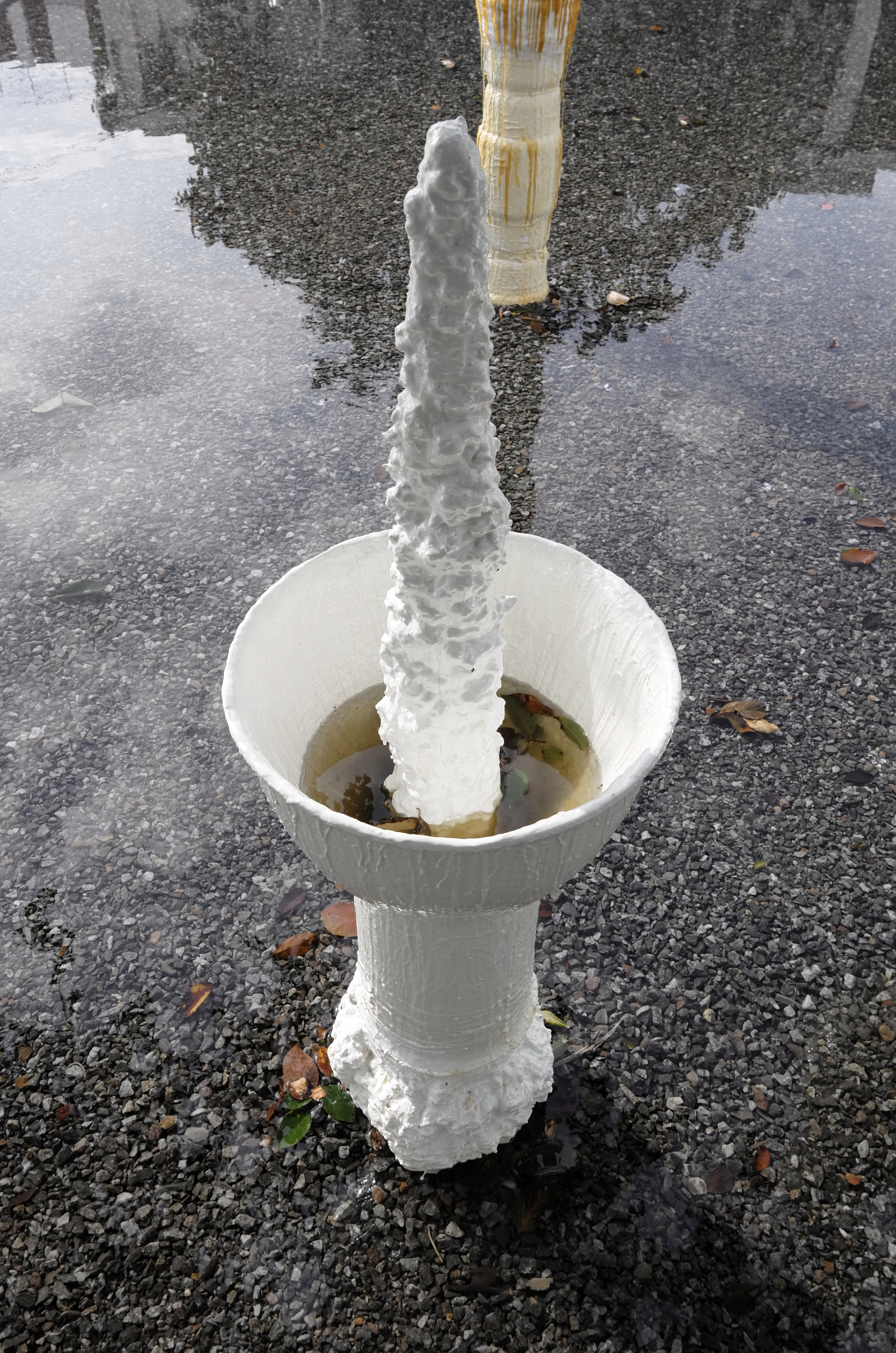 석고에 조색된 레진, 플라스틱 화분, 우레탄 레진, 석고 붕대, 구운 철사, 깃털 및 혼합매체