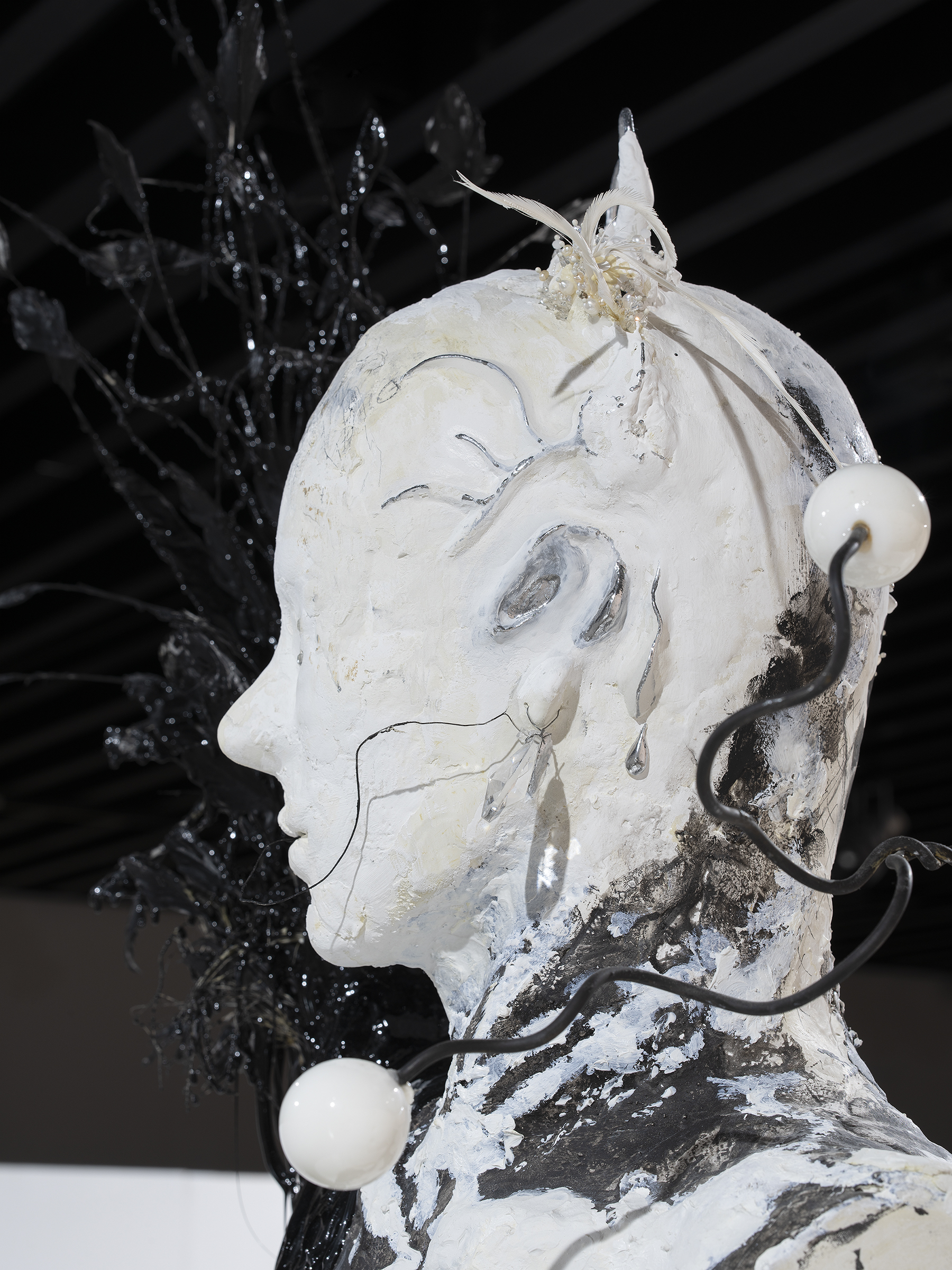 Glass ball, pigmented resin, plaster, silicone, gilding wax on baked wire, feather, aluminum and mixed media, 158×76×75cm