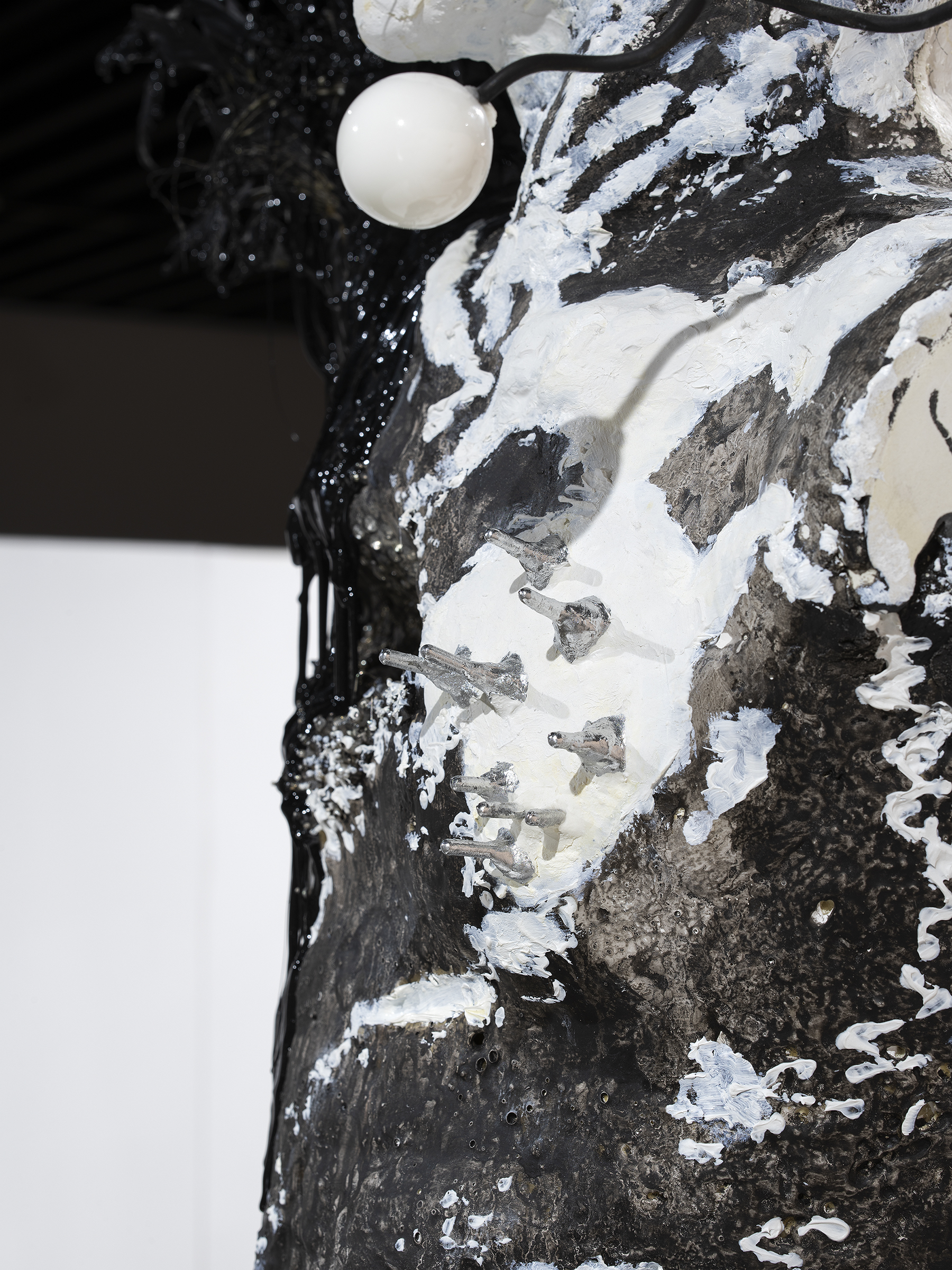 Paint, acrylic and oil on resin, various beads, graphite, feather, pearl, chrome ink, baked wire and mixed media, 221×88×68cm