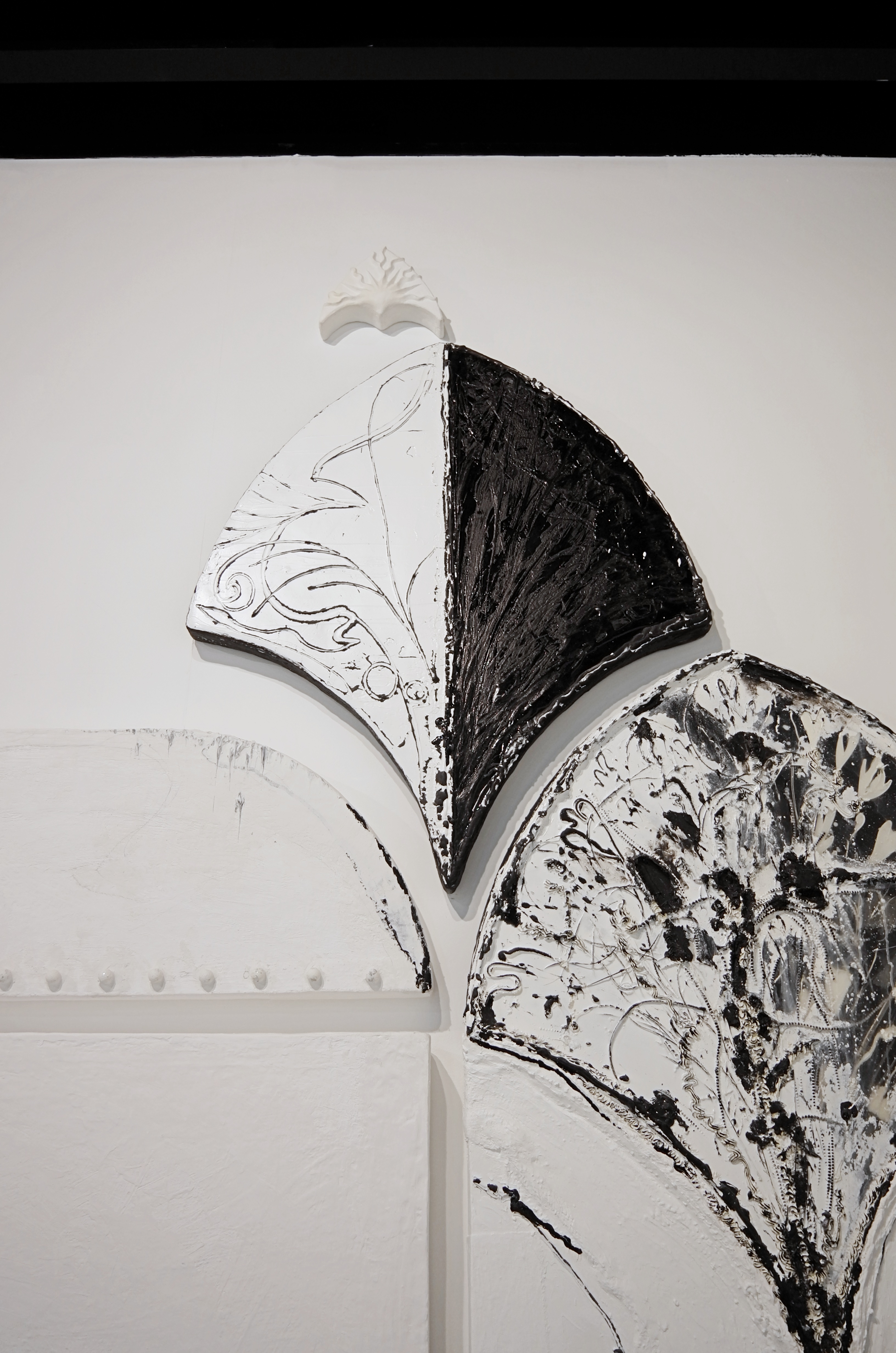 페인트 칠해진 석고에 레진, 실리콘, 다양한 구슬, 끈, 석고 및 혼합매체