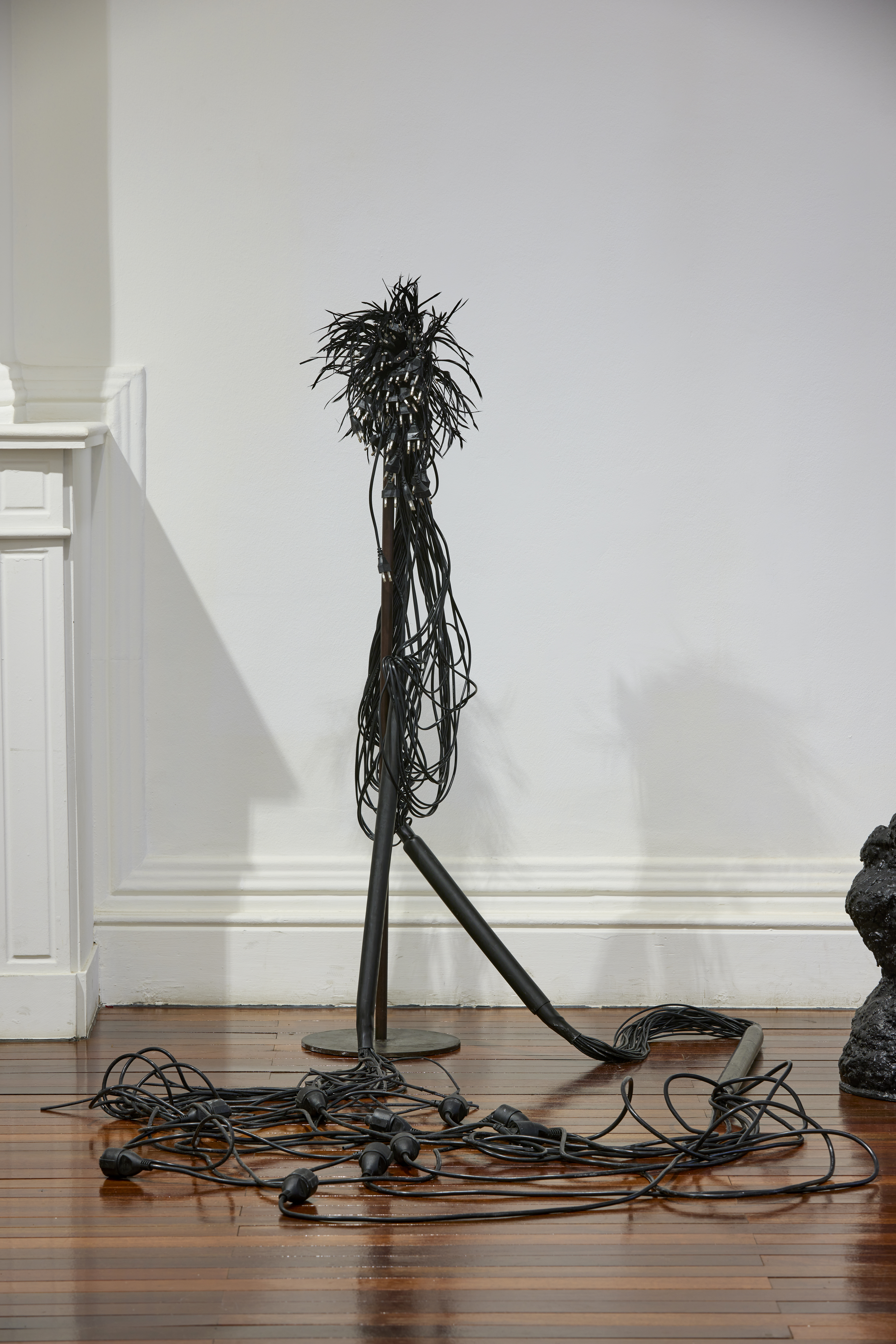 전선, 깃털, 전기플러그와 콘센트 및 혼합매체 Electric wire, feather, electrical plug and outlet and mixed media, 가변 크기 Dimensions variable