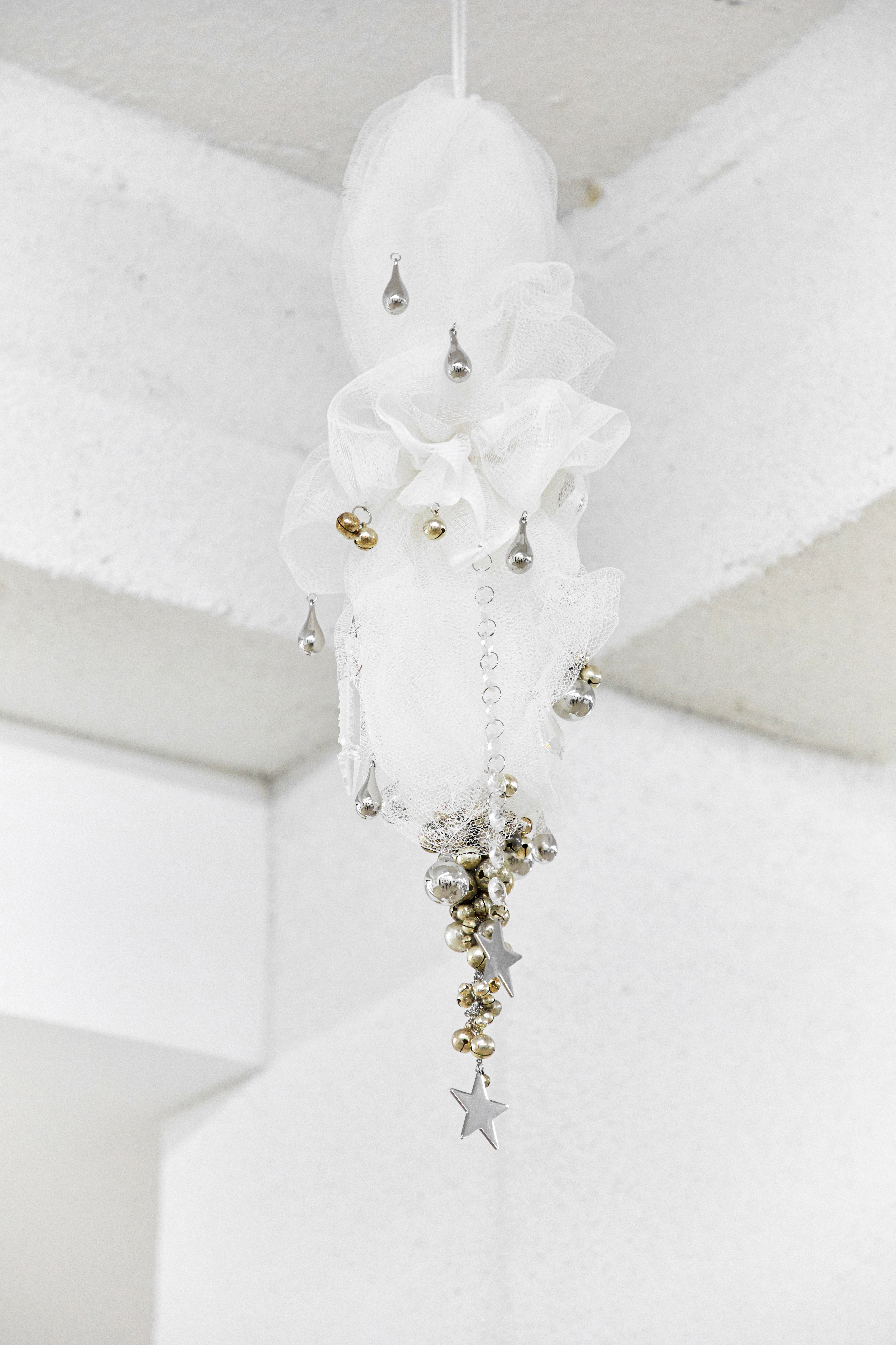 The shower loaf I’ve been using for a long time, iron bell, plastic beads, iron drop, crystal, glass, wire and mixed media, 107✕31✕36cm